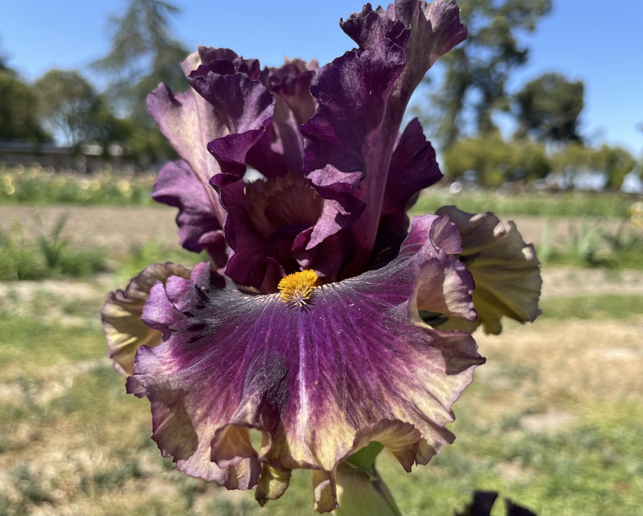 (Black 2018) ML; Mid slate violet standards; style arms dark brassy old gold; velvety charcoal dark purple-black falls; old gold beards; fragrant