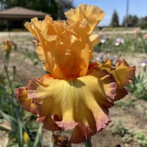 (Sutton 2010) L; Bright yellow standards, white streaks at edge; bright yellow falls with sunburst at beards blending to ruby red then lavender. (Awards: HM 2013)