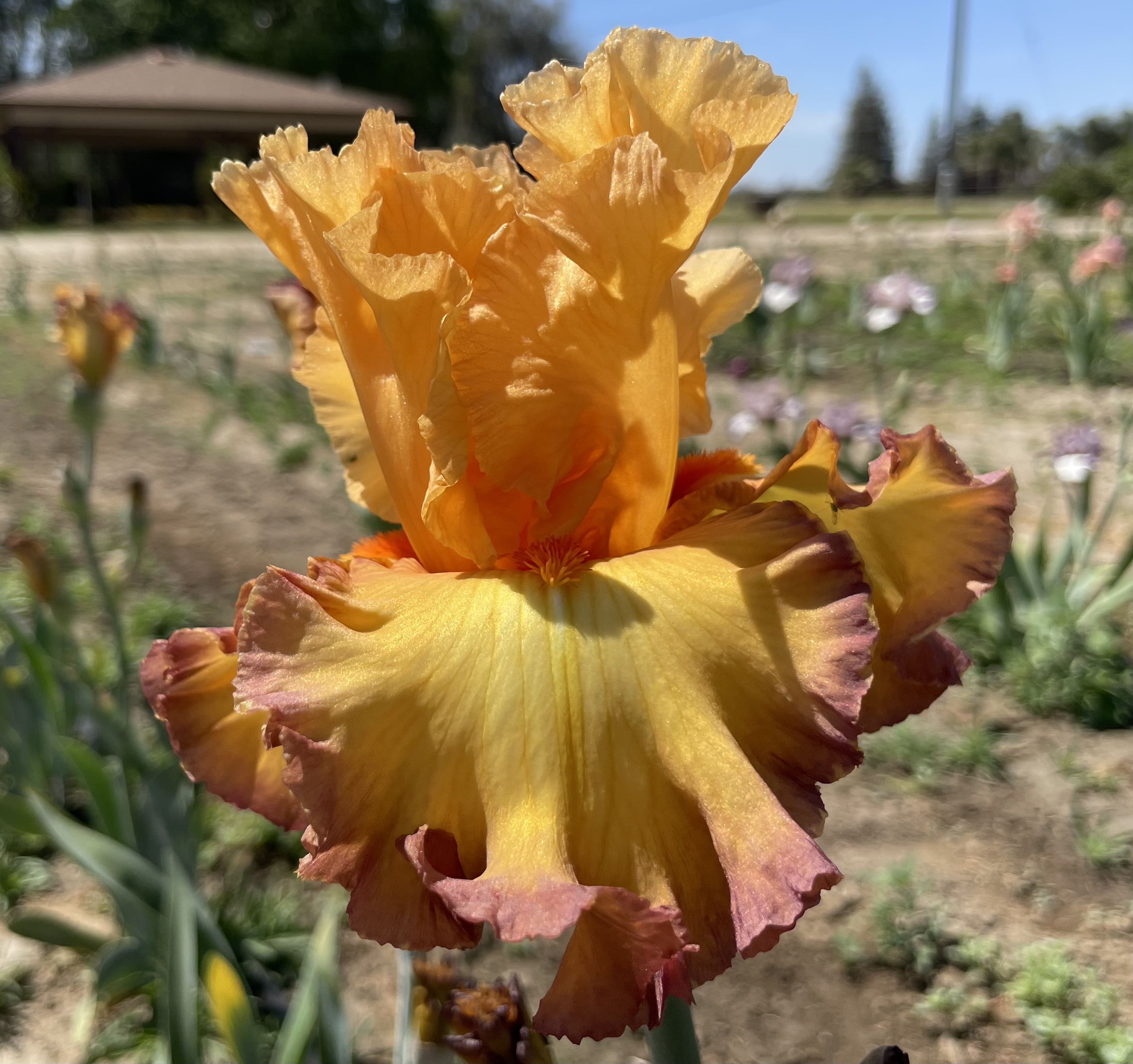 (Johnson 2013) M; Golden apricot standards; peach-orange falls edged with ruffled red-brown band; orange beards