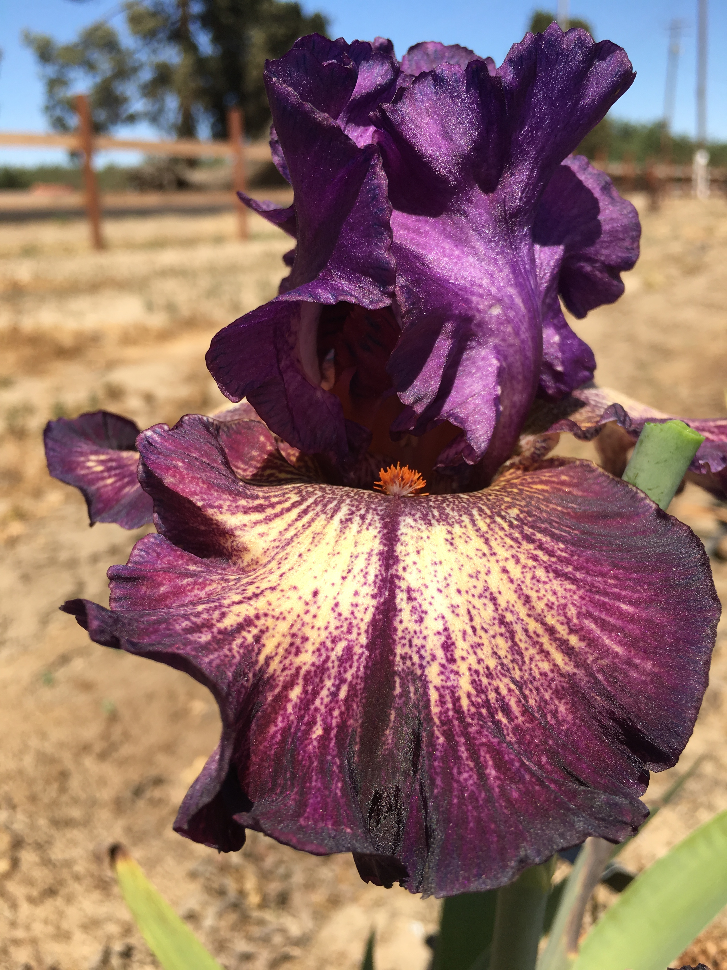 (Johnson 2017) E: Raspberry red standards; White falls overlaid with light to medium fall wash in center; raspberry plicata band; orange beards